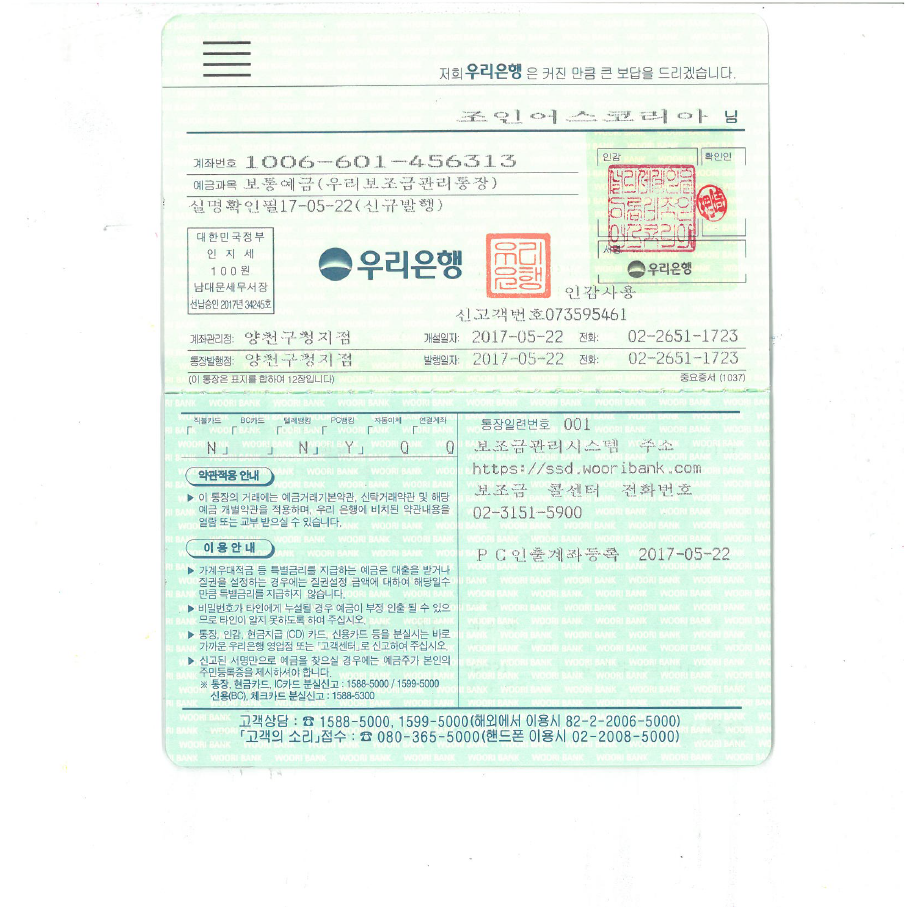 우리은행(Wooribank) 1006-601-456313 (예금주: 조인어스코리아)