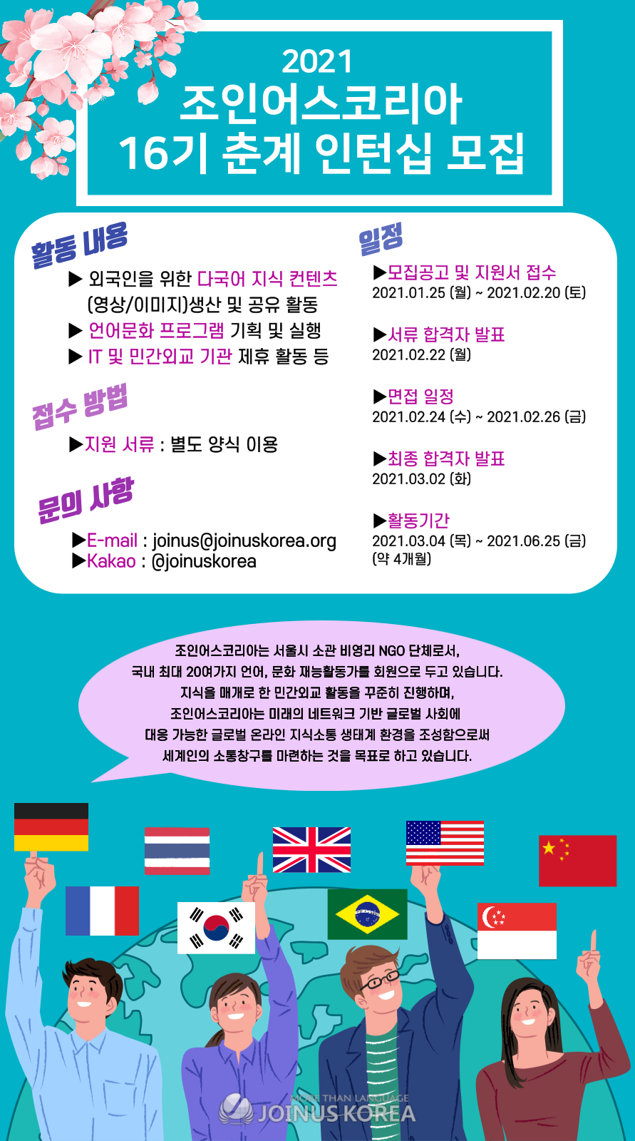 o 이메일/전화 : joinus@joinuskorea.org / 070-7839-5200 o 카카오톡 ID : @joinuskorea & 네이버 톡톡: 연락하기 - 전화 문의는 가급적 삼가해주시기 바랍니다.