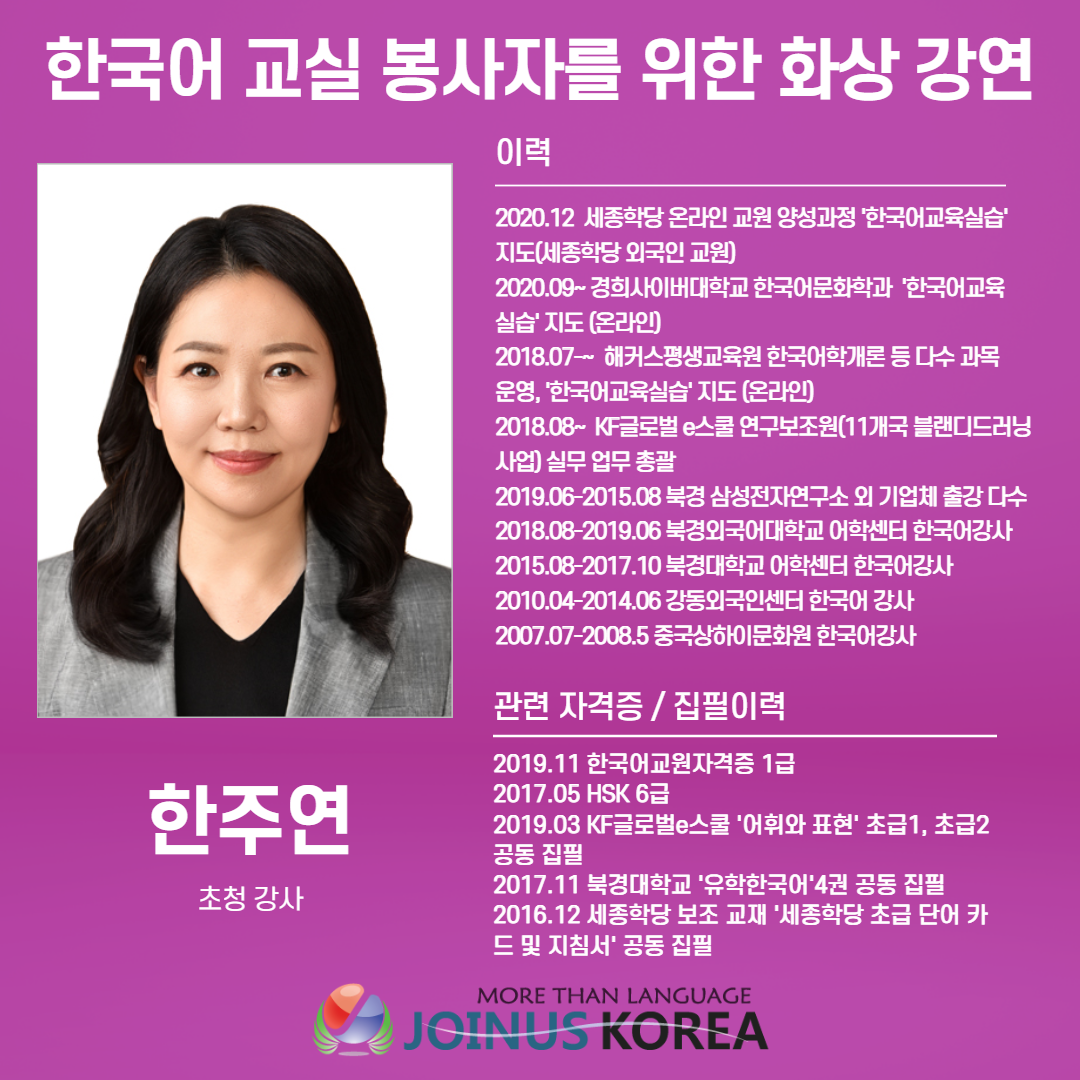 2021년 1월 31일 코로나로 인해 수업 플랫폼이 점점 온라인으로 바뀌어가고 있는 추세에 맞춰 한국어 교육 프로그램을 운영하고 있는 조인어스코리아는 한주연 강사님과 함께 한국어 강연자를 대상으로 한 효과적인 온라인 교수법 및 한국어 교육방법에 관한 강좌를 마련하였습니다.온라인 플랫폼인 Zoom 과 유튜브 실시간 스트리밍을 통해 수업을 진행하였으며다양한 연령대의 국내외에서 활동하는 약 200여명의 한국어 교육자분들이 적극적으로 수업에 참여하고자 하는 의지를 밝혔습니다. 조인어스코리아 측은 ‘대면 강의가 거의 불가능한 현 시국에서 초보 한국어 교육자들이 조금이나마 화상 강의를 준비하는데 도움이 되고자 강연을 주최하였다’고 언급하였습니다.