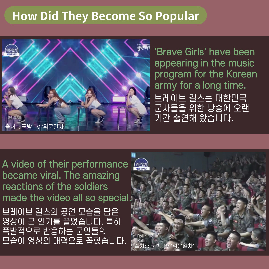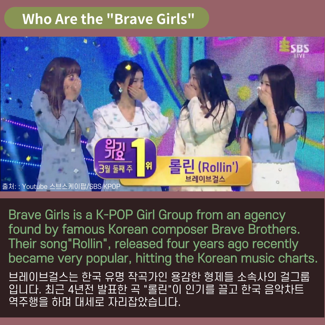 Have you heard of the K-pop girl group 'Brave Girls'? They have recently become very popular for their good songs and performances. Let's learn more about them and also learn some Korean expressions that you can use in your everyday life : )