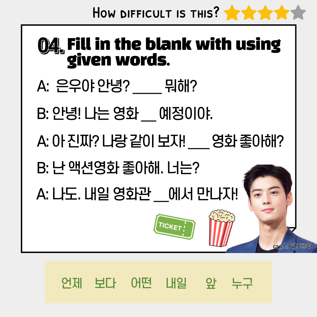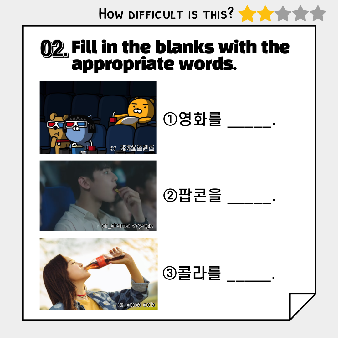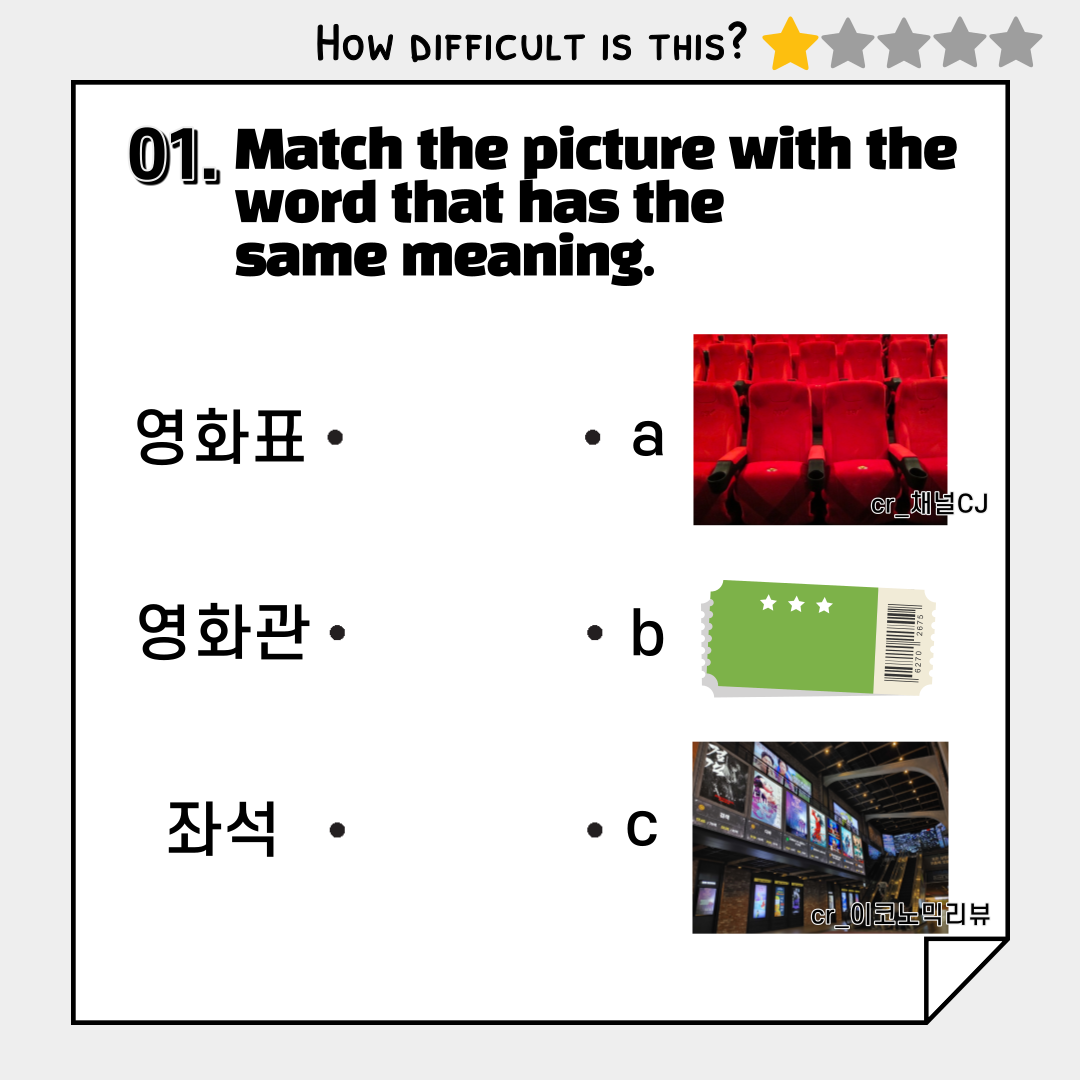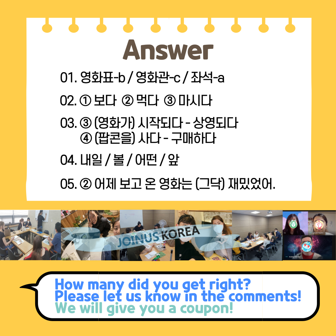 Take a quiz about Korean expressions used in movie theaters! After taking the quiz, please let us know how many you got right! We will give you a coupon💖
