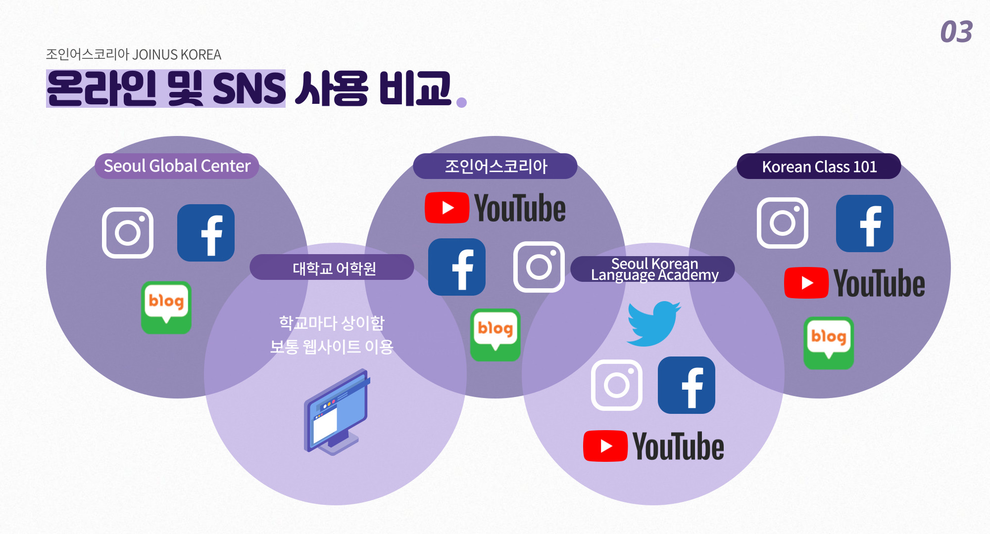 인스타그램, 페이스북, 유튜브, 조인어스코리아 공식 블로그 등 다양한 SNS를 통해 새로운 한국문화 및 한국어 관련 콘텐츠를 계속해서 제공 중이다. 카드뉴스부터 영상에 이르기까지, 다양한 콘텐츠들을 각 SNS계정과 조인어스코리아 블로그에서 접할 수 있다. (매일 업로드)
