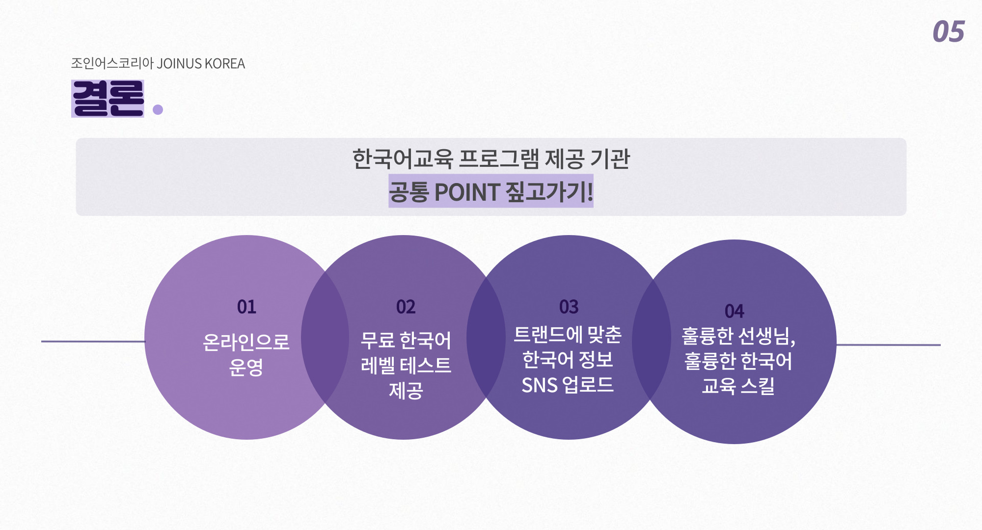 위의 분석을 통해, 우리는 각자에게 알맞는 한국어 교육 프로그램을 선택하기 위해서는 고려해봐야 하는 유의미한 특징들을 알아볼 수 있었다.