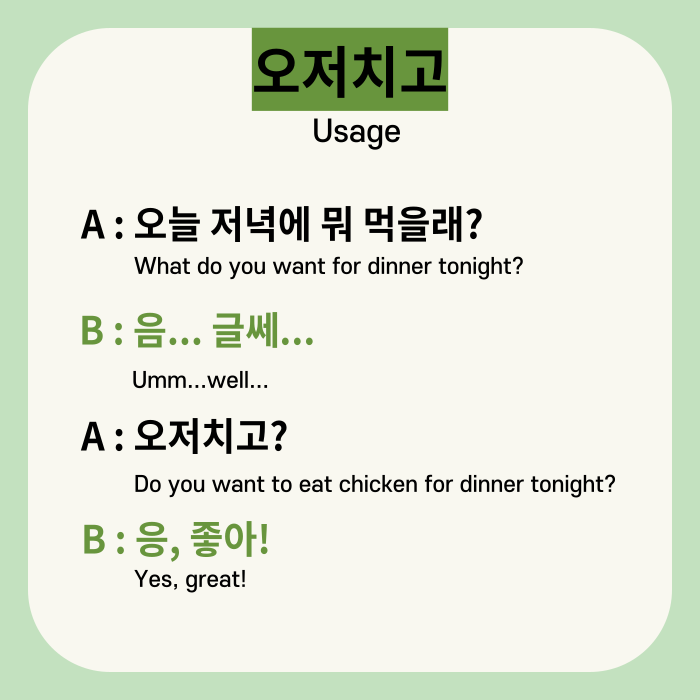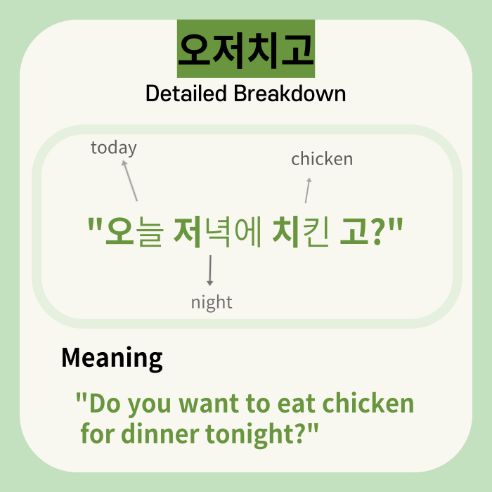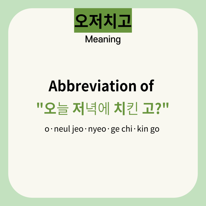 Have you ever heard this Korean word before? ‘오저치고’ is abbreviation of ‘오늘 저녁에 치킨 고’ and it means ‘Do you want to eat chicken for dinner tonight?’. 😋