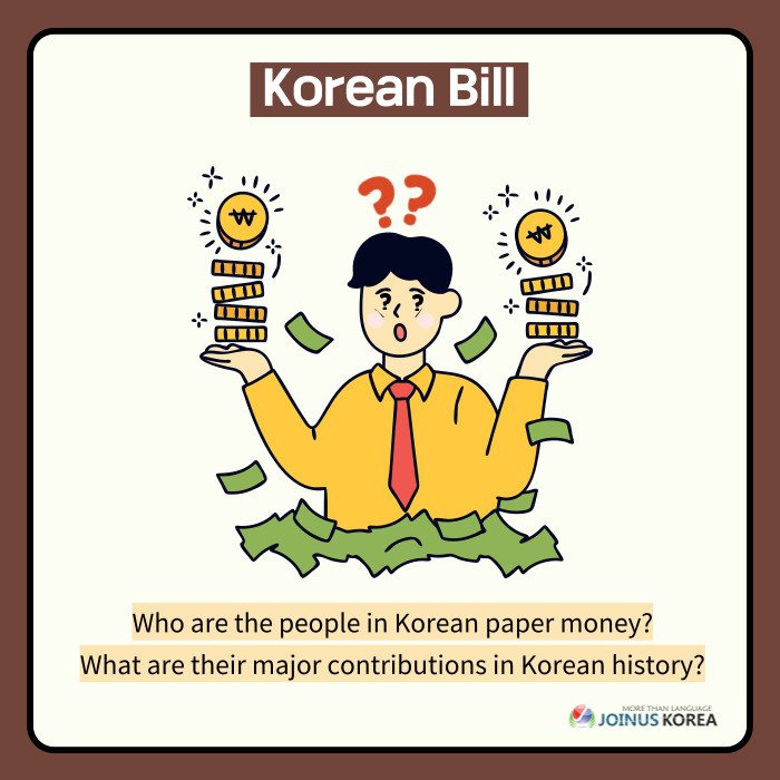 Have you ever wondered about the people in Korean paper money? We will briefly explain about the four historical figures in each bills. Swipe to find out who they are!