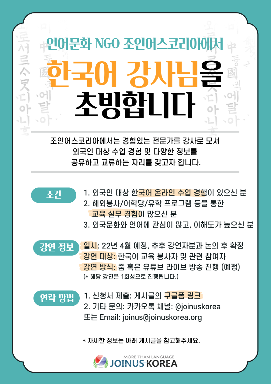 안녕하세요, 언어문화 NGO 조인어스코리아입니다.