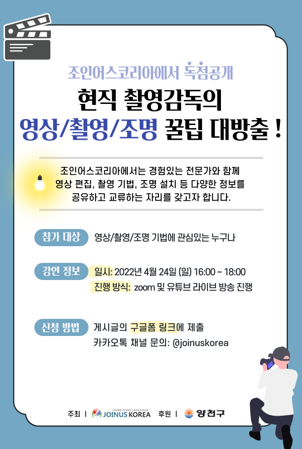 | - 단톡방 공지 : https://open.kakao.com/o/g7MOL1be (코드: joko0424) - 강연 줌 강의 입장 관련 공지: https://bit.ly/20220424촬영조명강연공지 |