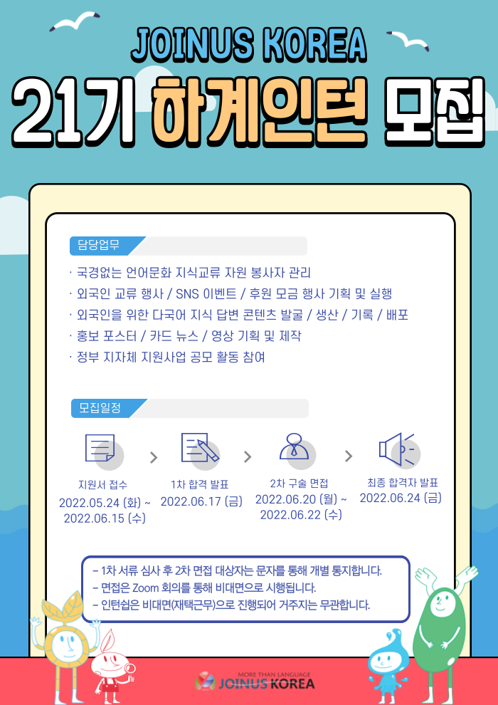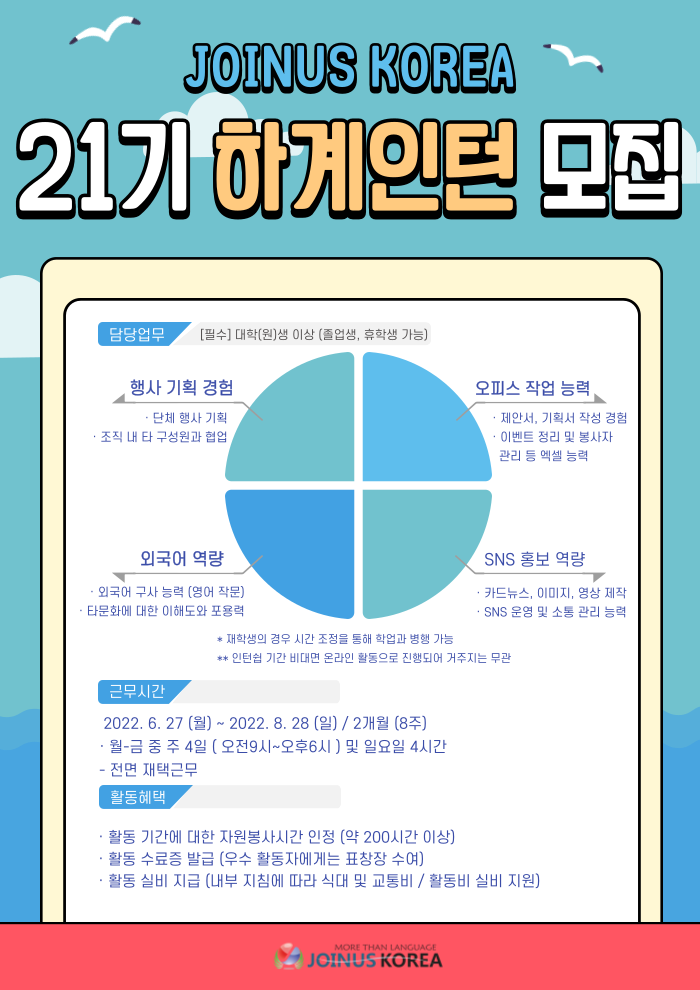 조인어스코리아는 서울시 소관 비영리 NGO 단체로서, 국내 최대 30여 가지 언어 문화 재능활동가들을 회원으로 두고 있습니다. 조인어스코리아는 온라인 상에서 세계인 모두가 함께 소통할 수 있는 글로벌 지식 고통 생태계를 조성하는 것을 목표로 하고 있습니다. 조인어스코리아와 함께 할 21기 하계 인턴을 모집합니다.