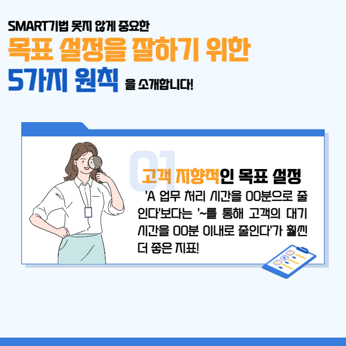 대표적인 목표 설정 방법인 S.M.A.R.T기법과 더불어 조인어스코리아가 제시하는 5가지 원칙을 아래 카드뉴스를 통해 확인해보세요! :)