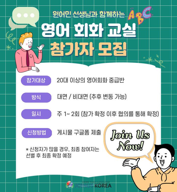 - 참가 대상: 20대 이상 영어회화 중급 (4~10명 이내 선발 예정, 추후 분반 확대)