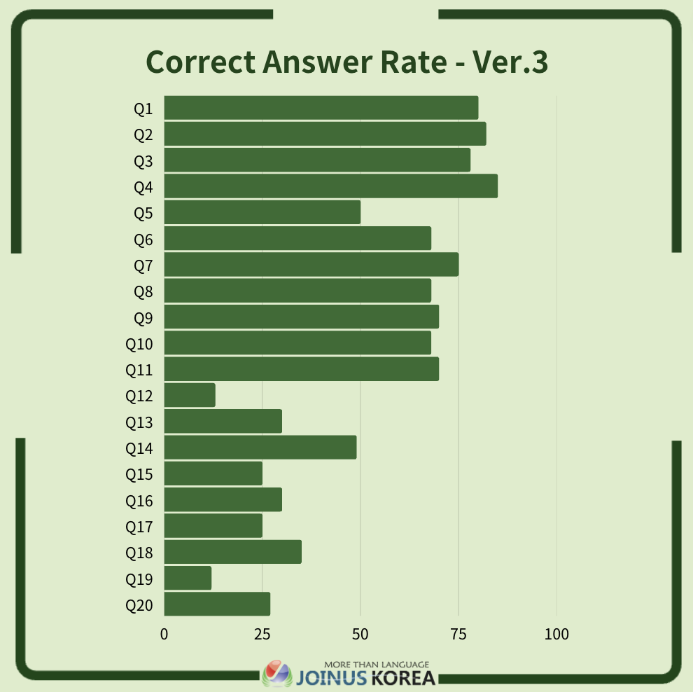 We would like to share the rankings and Correct Answer rates per question for those who have taken the test by the deadline. This will help participants assess their own proficiency level and identify weak points. Additionally, based on the results of the Korean Level Test, we would like to recommend Korean language classes offered by JOINUS KOREA.