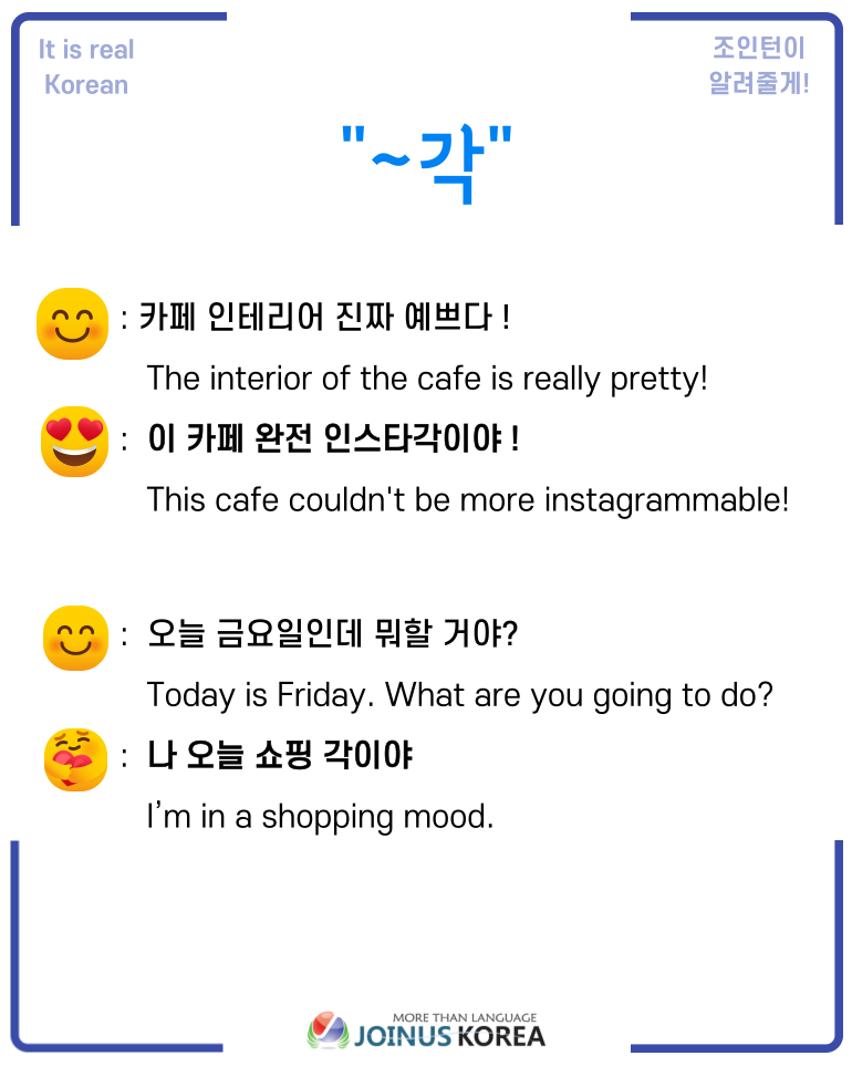 Today’s expression, ‘~각이야' is a buzzword that refers to a mood/situation/time in feeling/space/time
