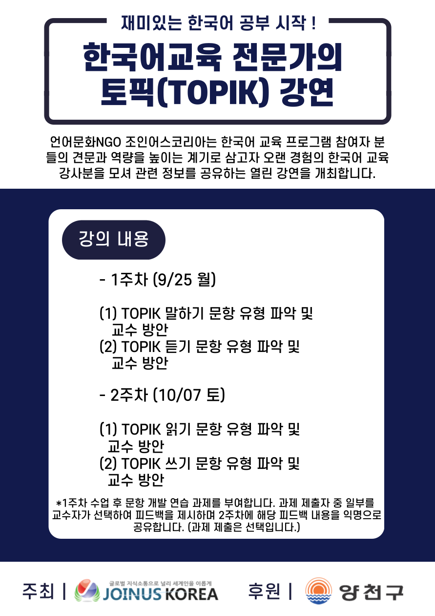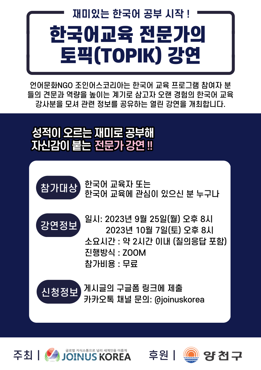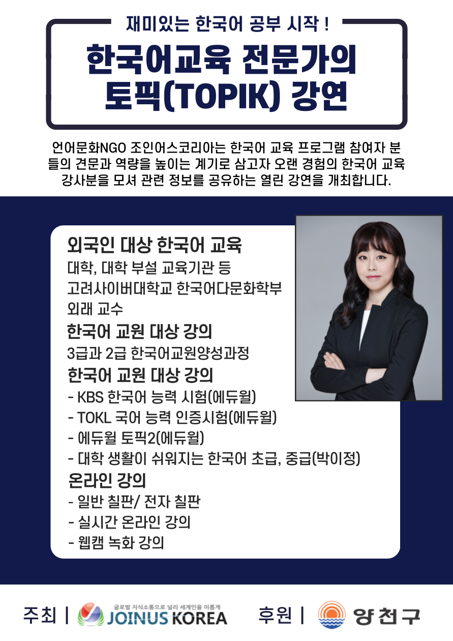 한국어 교육 강사분을 모셔 관련 정보를 공유하는 열린 강연을 개최합니다.