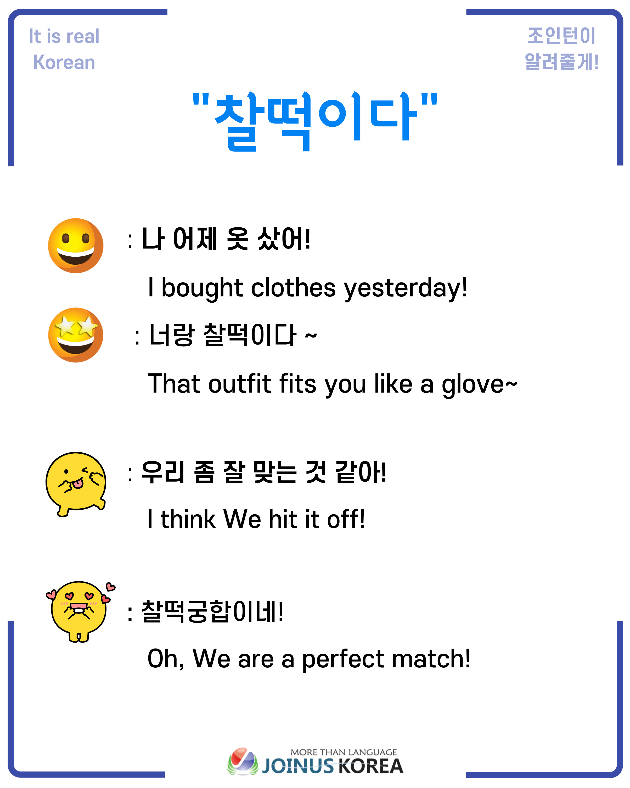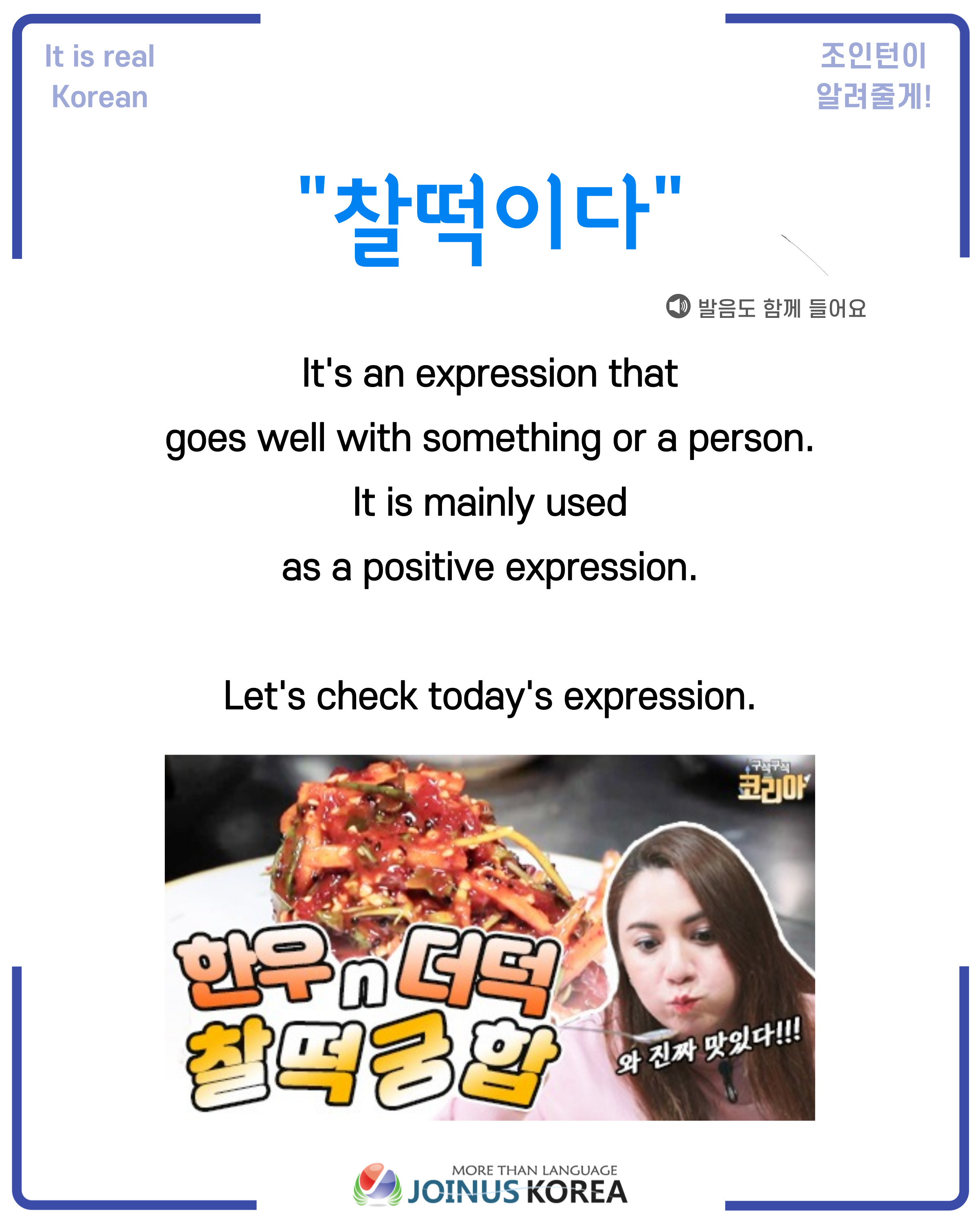 Today’s expression, ‘찰떡이다' is an expression meaning goes well with something or a person.