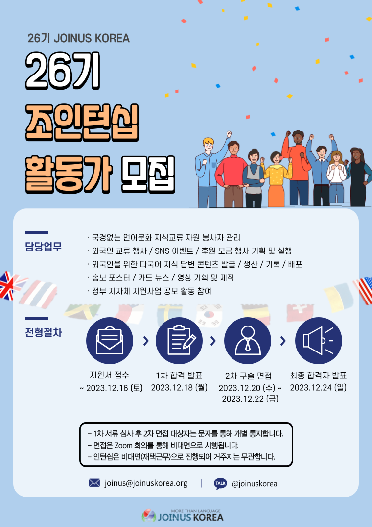 · 모집 공고 및 지원서 접수 : 2023. 12.16 (토) 자정까지 · 서류 합격자 발표: 2023.12.18 (월) (서류 합격자 개별 통보) : 공지 및 개별 문자 · 면접 일정: 2023. 12. 20 (수) ~ 2023. 12. 22 (금) *해당 일정 중 면접 시간 선택 가능 *면접장소: 줌 / 비대면 진행 · 최종 합격자 발표: 2023. 12. 24 (일) 오전 10시 (개별 통보) ·OT : 2023. 12.26 (화)