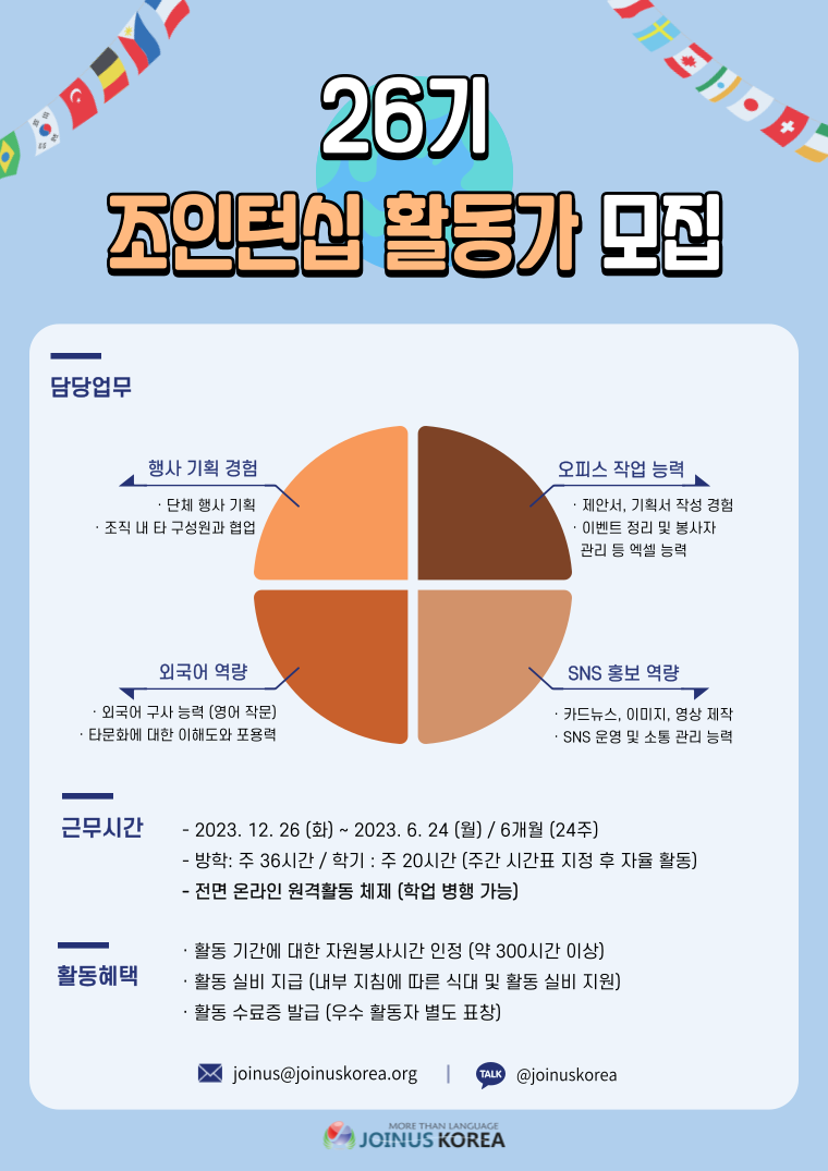 · 국경없는 언어문화 지식교류 자원 봉사자 관리 · 외국인 교류 행사 / SNS 이벤트 / 후원 모금 행사 기획 및 실행 · 외국인을 위한 다국어 지식 답변 콘텐츠 발굴 / 생산 / 기록 / 배포 · 홍보 포스터 / 카드 뉴스 / 영상 기획 및 제작 · 정부 지자체 지원사업 공모 활동 참여 · 자체 동아리 활동 지원