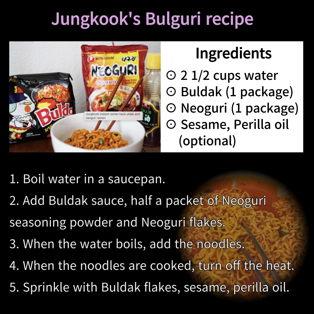 Especially BTS Jimin and Jungkook love buldak bokkeum myun(spicy chicken noodles) very much.