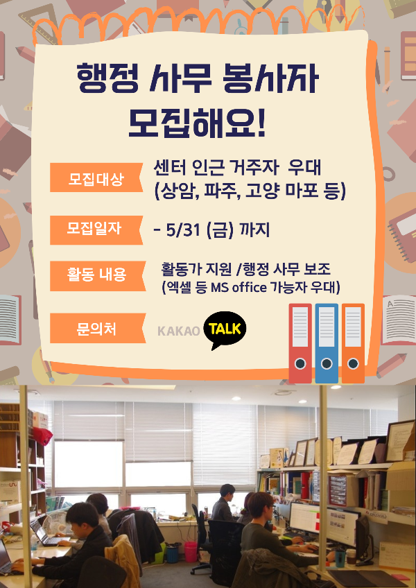 언어문화교류(노을)센터에서 행정 사무 봉사자를 충원 중입니다!