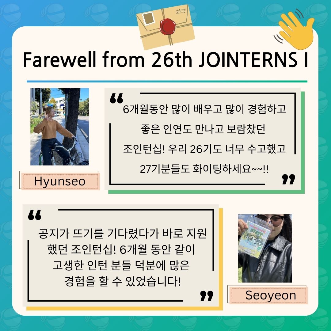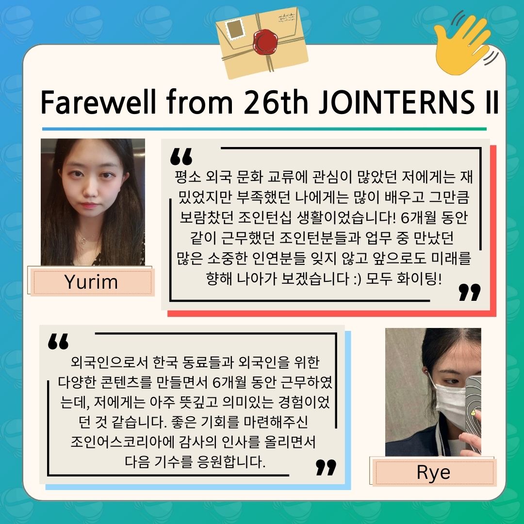 드디어 6월이 되고 여름이 돌아왔습니다~~ 여러분들은 한국 여름을 경험해 보셨나요? 날이 더운 만큼 여름과 더위에 관한 다양한 단어들이 있습니다. 이번 컨텐츠에선 퀴즈를 통해 한국의 여름을 알아보고 여름에 갈 만한 한국 휴양지도 함께 알아보는건 어떨까요? 그리고 이번 컨텐츠가 조인턴 26기의 마지막 컨텐츠인만큼 소감도 들어보고 곧 새로 돌아올 27기도 많은 기대 부탁드립니다~~!! 지금까지 많은 관심과 호응을 주셔서 감사했습니다! 한국에서 즐겁고 건강한 여름 보내시길 바라겠습니다~~😀❣️