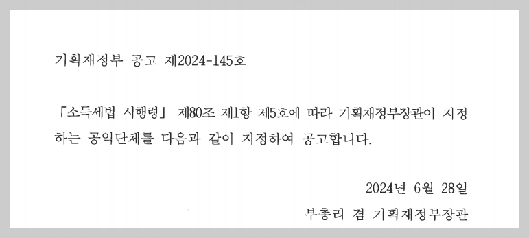 공익 단체 (구 기부금대상 민간단체) (재)지정 안내 (~ 2029.12.31)