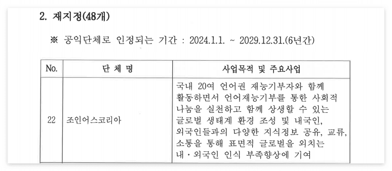 - 원문(행정안전부 홈페이지)  :  2024년 상반기 공익단체 지정 안내