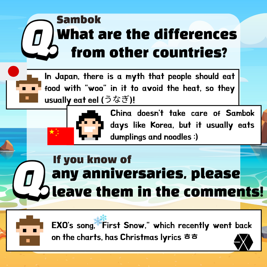 Half of 2024 has already passed, and July is here :) July brings both heatwaves and the rainy season, but it also includes the unmissable Sambok days 🥵 This time, we've prepared content about "Sambok (삼복/ 三伏)"! Sambok is a Korean tradition marking the hottest days of summer. It focuses on boosting energy with nourishing foods during this time. Everyone, enjoy some healthy food and have an energetic week~!