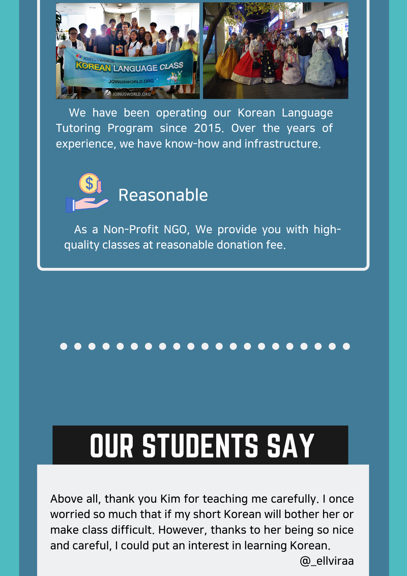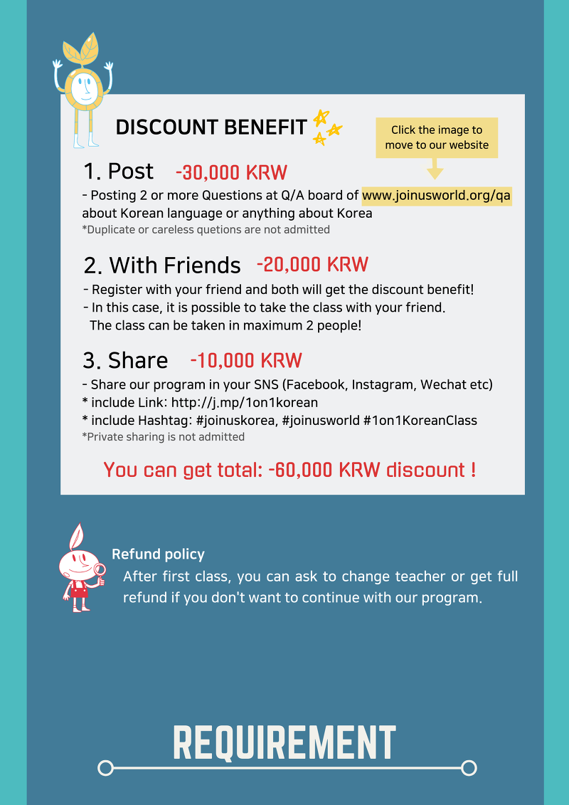 - # Benefit 3 :share the link below in your SNS (Facebook, Instagram, Wechat etc) with the name of the post: “1:1 Korean Classes” and hashtags #joinuskorea, #joinusworld #1on1KoreanClass