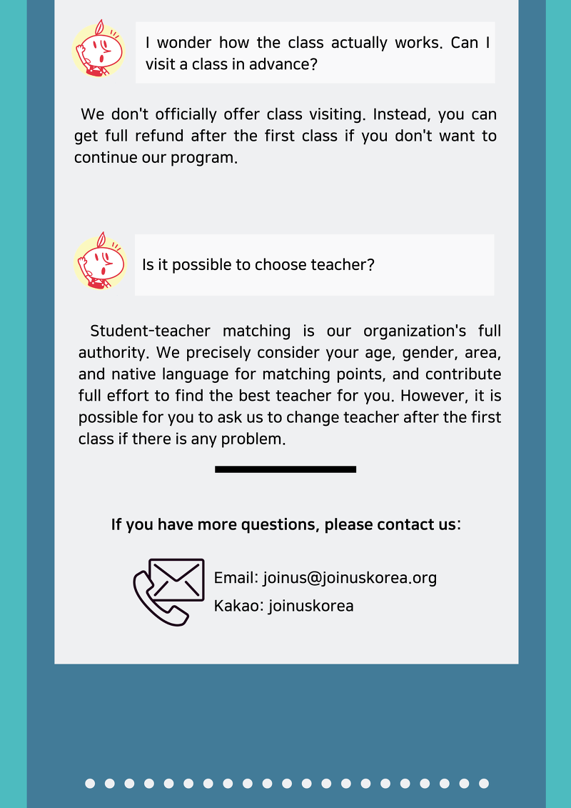 After the first tutoring/class , you can ask to change your teacher or get full refund if you don't want to continue our program in the future.