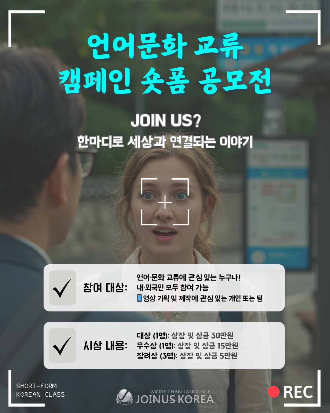 JOINUS KOREA에서 외국인과 내국인이 함께 참여하고 즐길 수 있는 언어문화 교류 캠페인 숏폼 공모전을 개최합니다!
