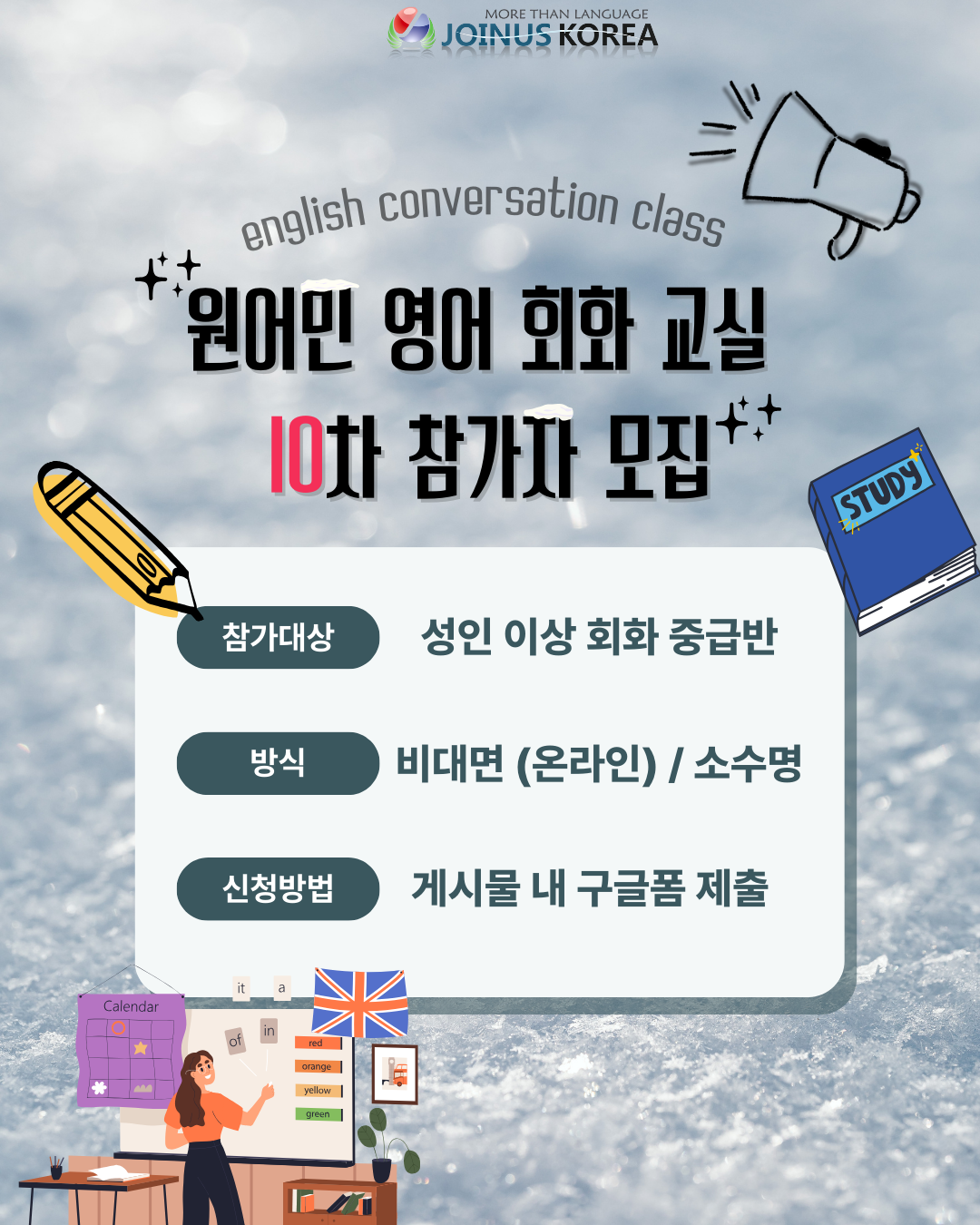 지난 9기까지 폭발적인 참여와 “정말 도움이 됐다!”는 뜨거운 후기로 드디어 제10차 원어민 영어 회화교실이 돌아왔습니다! 🎉🎉