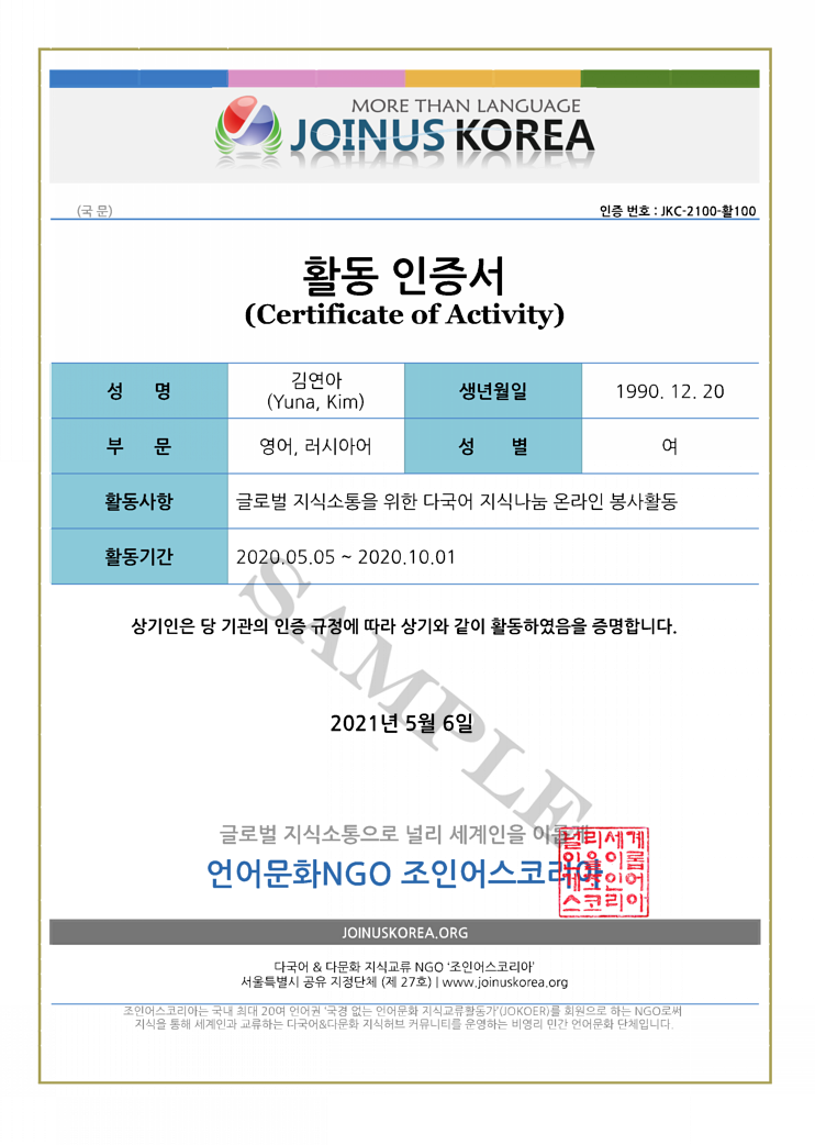 조인어스코리아는 국내 최대 20 언어권 ‘국경 없는 언어문화 지식교류활동가’(JOKOER)를 회원으로 하는 NGO로써,